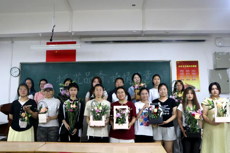活动现场,绿景公社和译心心理辅导站为同学们准备了多种鲜花及配套工具,同时还为同学们细致地讲授如何修剪和整理各种花材,并现场进行插花展示。随后同学们自由组队,发挥创意进行插花创作。在轻松愉快的氛围中,大家相互交流、共同创作,经过一个多小时的精心制作,各小组都完成了各具特色的插花作品,并手持作品合影留念,记录下这美好的时刻。参与同学表示,活动不仅让大家学习了插花技巧,更在创作过程中放松了心情、收获了快乐。